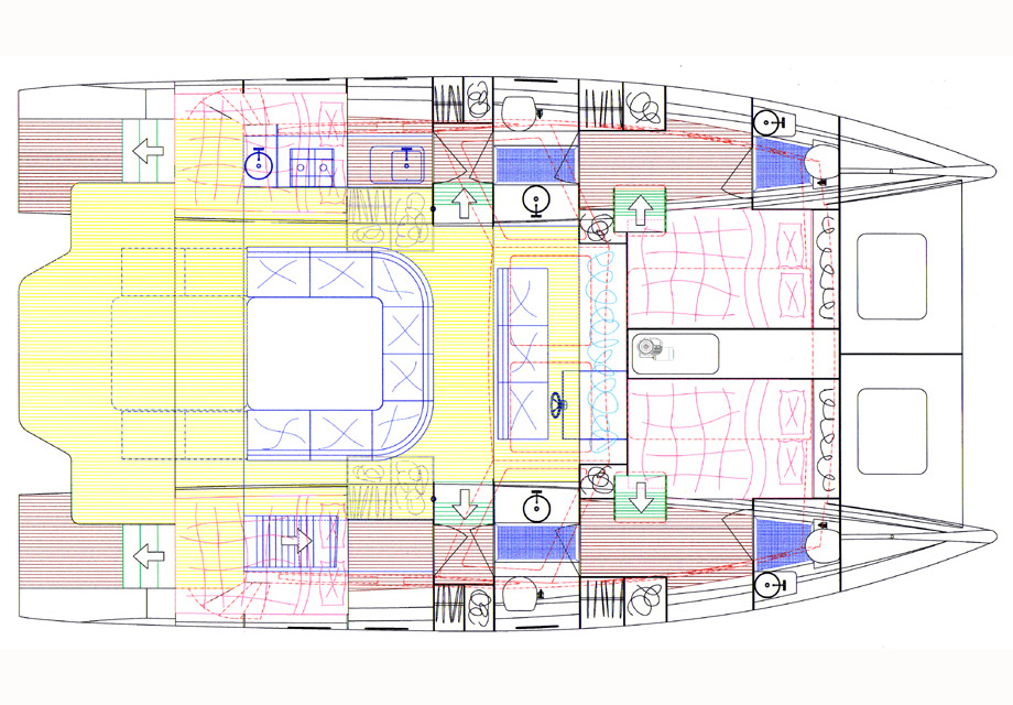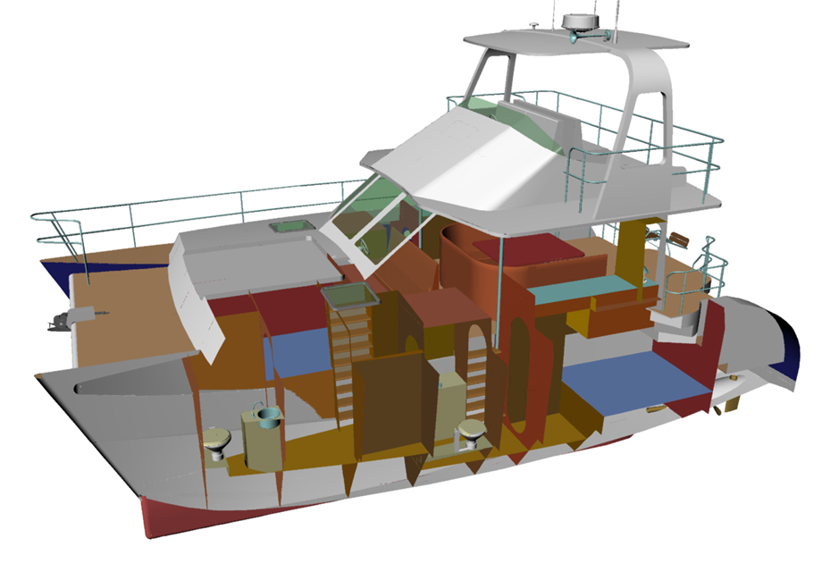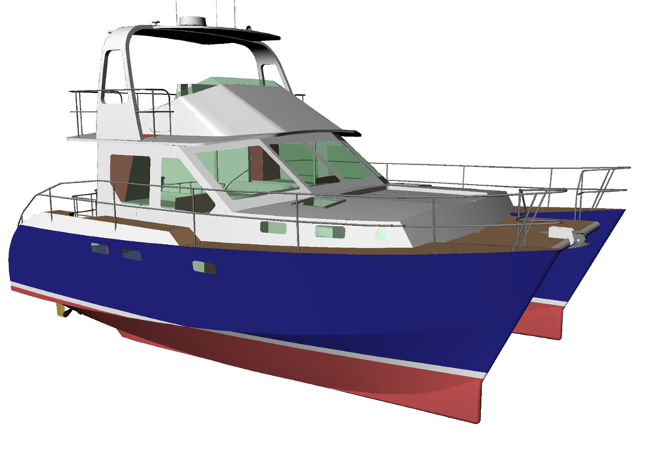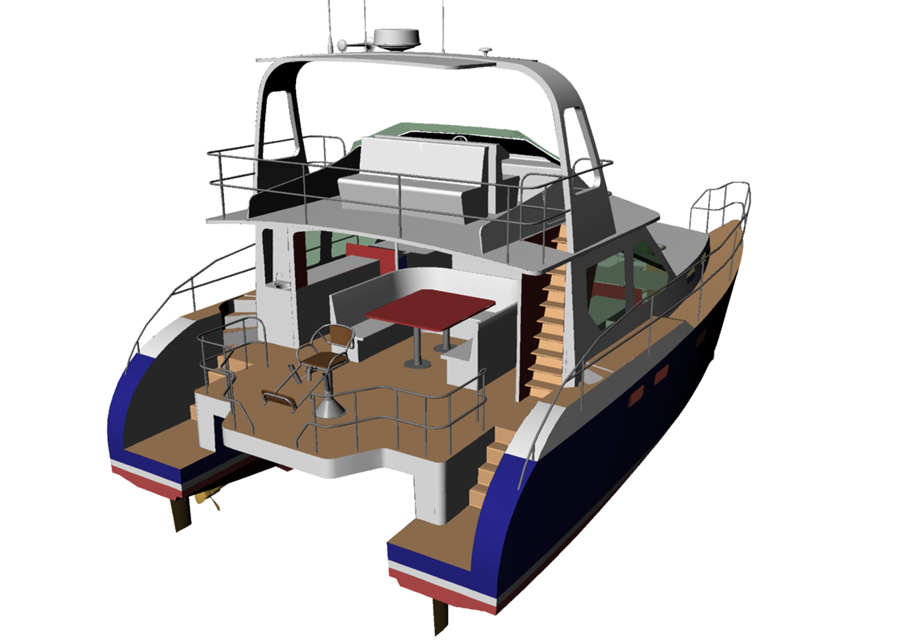 Mayrik P37 is not an ordinary catamaran. Its great beam, its huge interior volume make it possible to place easily four cabins, four bathrooms, an enormous saloon as well as a broad cockpit like a wheelhouse of cargo liner. The whole in only 11,33m length. It can with the order being arranged according to various versions: trawler, version owner, day charter, charter, sporting fishing, with or without fly-bridge. The asymmetrical hulls, the stems with bulb and the powerful engines make a fast and marine boat of it. |