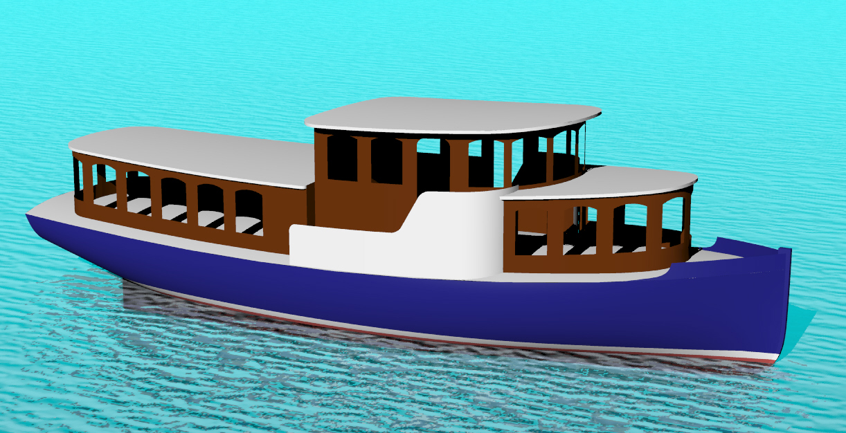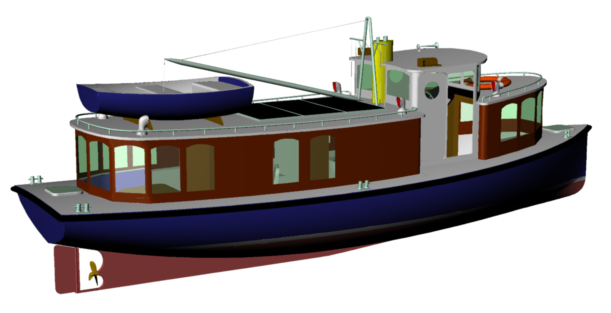 | Autre projet dans la même idée un peu rétro, mais destiné cette fois uniquement à la navigation fluviale. La propulsion est d'ailleurs assurée par un ensemble diesel électrique. On peut assurer une partie de la propulsion par le choix de panneaux solaires répartis sur les différents toits. De quoi assurer quelques heures d'autonomie. | |||||||||
