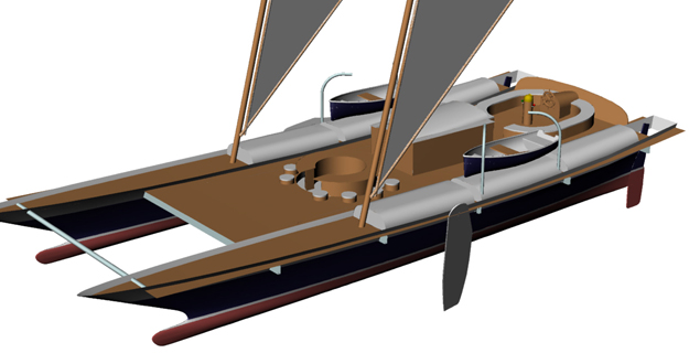 | Ce projet original est dû dans sa définition au client qui savait exactement ce qu'il voulait. Sur le modèle des "long tails" du sud-est asiatique, il a imaginé un catamaran à la mode polynésienne exploitant le gréement en pince de crabe des "lakatoi" du Pacifique. Sans doute construit en aluminium en Corée ou en Thaïlande, ce bateau étonnera plus d'un car ses coques très fines dotées d'un bulbe perce vagues équipées de deux gréement s "Crab Claw" , dont on sait qu'il est supérieur au marconi classique par allure du travers au largue, devrait être très performant. |
