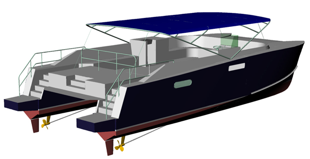 | Avant projet d'un catamaran polyvalent pouvant faire de la sortie à la journée, servir de plate-forme pour des plongeurs, ou comme bateau promenade. Très volumineux, on peut même imaginer y loger quelques couchettes. Prévu pour être construit en contreplaqué époxy pour un client à Saint Martin. Propulsé par deux Yanmar de 100cv, il se révélera économe à l'usage. La plate forme arrière peut éventuellement être remplacée par un bracket pour accueillir un moteur hors-bord. Une version électrique est possible. |