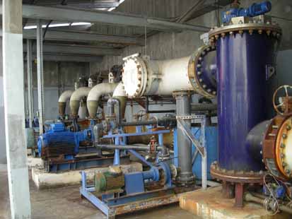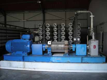 Les pompes haute pression. A gauche le moteur électrique, au centre la pompe centrifuge multi étages, à droite la turbine Pelton. Derrière, les tubes contenant les membranes pour l’osmose. |