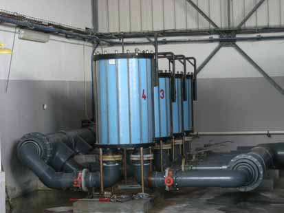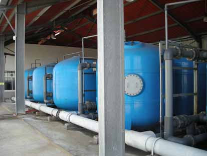 Les pompes aspirent alors l’eau à travers une crépine pour entamer le processus par une série de filtres à sable qui éliminent la plupart des impuretés. |