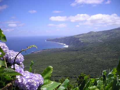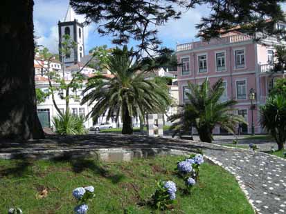 Hôtel de ville et une église. L'île voisine de Pico, volcan encore actif. Un parc à Horta avec des hortensias, emblème de l'île. Un volcan né il y a quelques décennies (Capelinhos) Une baleinière avec laquelle les açoriens chassaient. |
