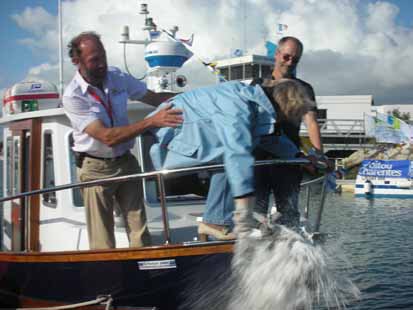 Açores – Saint Martin de Ré. Une nouvelle fois réparé, le pilote retombera illico en panne dès le départ le 4 juillet, ce qui nous conduisit à l’île voisine de Sao Jorge pour tenter de réparer. Le lendemain, il fallait se résigner à barrer jusqu’au bout, le pilote rendant une fois de plus l’âme quelques heures après le nouveau départ. Décidément, les deux instruments les plus importants, le pilote et le radar, ne nous auront pas été d’un grand secours durant ce voyage. Le radar en effet, flambant neuf, est en panne depuis le lendemain du départ de Saint Martin et ne sera réparé sous garantie qu’à La Rochelle bien longtemps après (magnétron inexplicablement fichu). Cette dernière partie du voyage est la plus dangereuse car l’approche du célèbre Golfe de Gascogne ne peut se faire sans appréhension. Sa triste réputation sur base de mer difficile ajoutée au croisement des routes de navigation, la traversée des zones de pêche et un climat très changeant sous l’influence des grandes dépressions océaniques empilent les difficultés. Si au final la traversée se déroula sans incidents notables, mis à part une petite panne moteur due à un filtre bouché, ce ne fut pas sans appréhension certains jours. En effet, une puissante dépression se creusa quelques jours après notre départ, nous menaçant dans notre nord. Un moment la question se posa de se dérouter vers le sud, mais notre vitesse insuffisante rendait bien illusoire le gain éventuel. Pour finir, la dépression eut le bon goût de passer un peu plus nord que prévu, nous épargnant (elle fut par contre très bénéfique pour Thomas Coville qui pulvérisa le record de traversée de l’Atlantique nord sur son maxi trimaran, éclipsant d’ailleurs involontairement notre traversée dans les médias). L’entrée dans le golfe et la traversée de la route de navigation qui joint les deux Finistère (le français et l’espagnol), se déroula sans voir grand-chose. Peu de bateau et très loin. Aucun pêcheur non plus. A un jour d’intervalle nous eûmes deux petites frayeurs. La première fois quand le moteur après quelques hésitations décida de s’arrêter. Un filtre de gasoil trop vieux qu’il n’avait pas été possible de changer sur la route limitait le débit, empêchant de conserver une vitesse suffisante pour arriver selon l’horaire prévu le 14 juillet. C’est évidemment à ce moment qu’un pétrolier choisit de nous foncer dessus, ne déviant sa route qu’à la dernière minute. L’autre anecdote, sans risque cette fois, fut quand un énorme transporteur de voitures passa à nous frôler alors que nous ne l’avions pas vu, ni l’un ni l’autre. Moi, j’écrivais à l’ordinateur à la table du carré tandis que Alain appuyé sur le montant de la porte lui tournait le dos en barrant. Plus d’émotion par la découverte imprévue que de risque. C’est sur une véritable mer d’huile, sans un poil de vent, par une douce chaleur et un beau soleil, escorté par quelques requins que nous sommes arrivés le 14 juillet sans plus de soucis en vue de l’île de Ré. Trop tard pour rentrer ce jour-là à Saint Martin de Ré, nous sommes allés mouiller au bord d’une petite plage sur laquelle, plaisir immense, nous attendaient Bulent (le président de Métimer) et surtout ma chère épouse. Un pêcheur du coin nous amena à la plage et nous sommes tombés dans les bras l’un de l’autre : ça y est, c’est fait. Le rêve est accompli, s’inscrivant dans l’histoire.