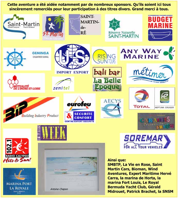 Saint Martin Bermudes: 850 miles en 6,5 jours Bermudes Horta: 1850 miles 14,5 jours Horta Saint Martin de Ré: 1277 miles en 10,5 j. Soit au total 3.977 miles en 31,5 jours de navigation répartis sur deux mois.