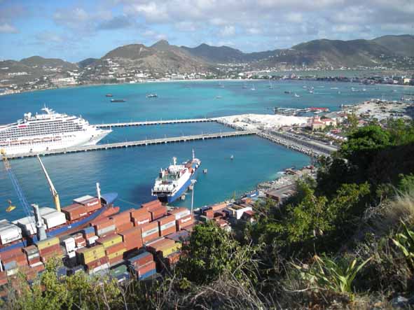 Le port de Philipsburg avec en oblique le "Cap Canaille", et derrière le deuxième quai pour la croisière. |