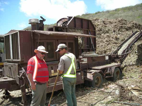 Jean-Pierre Tey (à gauche) auprès du broyeur de végétaux. |