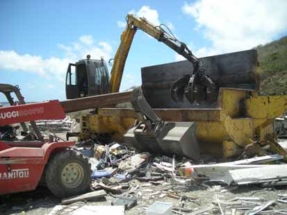 La deuxième vie de nos déchets. Saint Martin n’est pas un site facile à gérer. Des dizaines d’années d’habitudes ont ancré des mécanismes qui compliquent la tâche de l’exploitant. En effet, il faudrait obtenir que les déchets soient le plus possible triés. D’un côté les végétaux, qui seront broyés et transformés en compost, puis les ordures ménagères qui elles, sont malheureusement à peine triées vu que tout arrive par les camions de la ville sans sélection à la base (ce qui se fait à beaucoup d’endroits, mais semble inexplicablement impossible ici. Mais c’est une norme européenne, et tôt ou tard, il faudra bien l’appliquer). Il y a les encombrants où là aussi le problème se pose du tri à l’origine. Les camions de la ville en effet ramassent tout et c’est finalement à l’arrivée qu’il faut séparer l’électro-ménager, la ferraille des végétaux, les batteries d’avec les vieux meubles, etc…, alors qu’il devrait être plus simple de faire des collectes sélectives, avec un type de déchets selon des jours précis (ce que la Collectivité commence à mettre en place en ayant déjà publié un calendrier des enlèvements par type de déchets. Une grande communication doit être lancée prochainement aussi bien dans les écoles qu’auprès de la population). Seuls aujourd’hui le verre et le plastique sont triés et arrivent à la décharge pour y être traités. Le verre part au broyeur qui va réduire les bouteilles en graviers et en sable, un crible séparant en fonction de la granulométrie. Même les capsules et les étiquettes sortent séparément. Au final, on fait une très bonne base pour préparer du béton. D’ailleurs les installations de retraitement sont posées sur des constructions qui n’ont pas fait appel à un seul caillou. Les gros déchets encombrants sont donc triés, aluminium d’un côté, acier de l’autre, cuivre, plastique, bois sont séparés et orientés. |