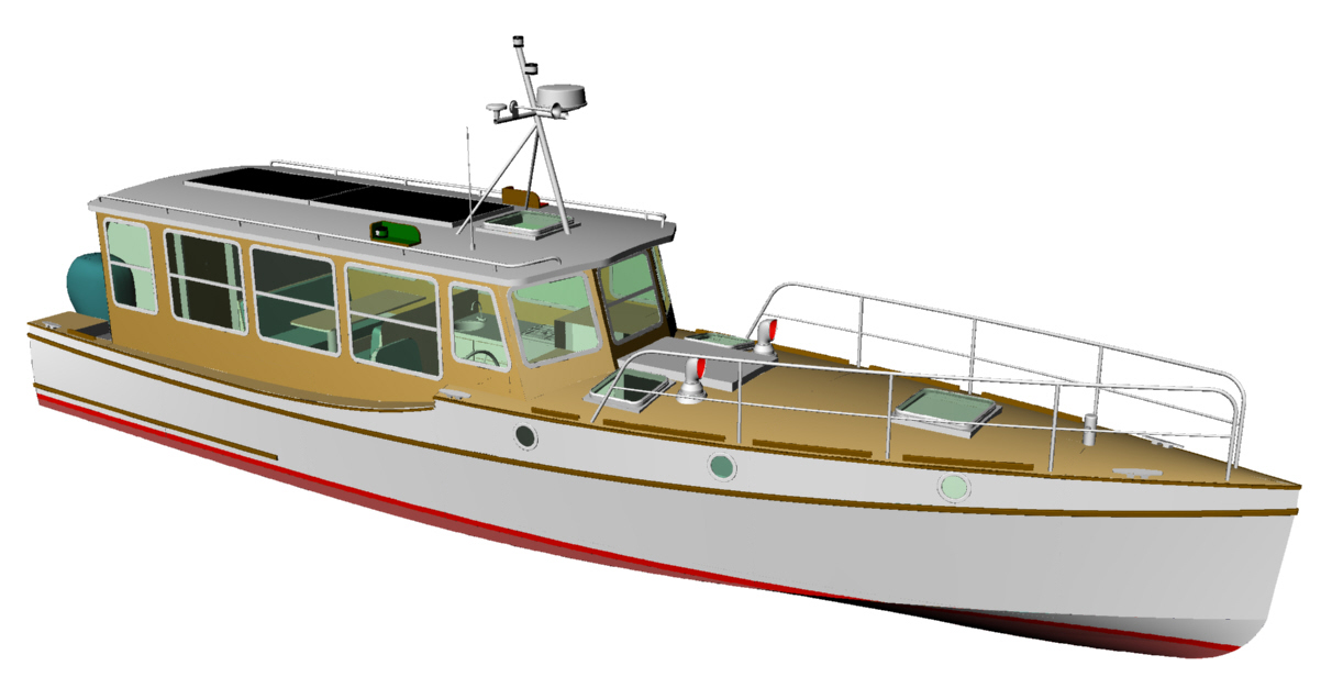 Studied to answer the requests of the regional and European authorities which wish to see the fishermen deviating from the coastal zone, this boat has the range and the sleeping to make it possible to remain several days at sea. Fix refrigerator, ice machine, all is designed to practice traditional fishings of these areas. The hull, based on that of traditional “saintoises” will pass well at sea. Two drawings are proposed: one, single engine with a displacement hull out of thick aluminum, the other with two engines and a traditional aluminum structure with stringers and frames. |